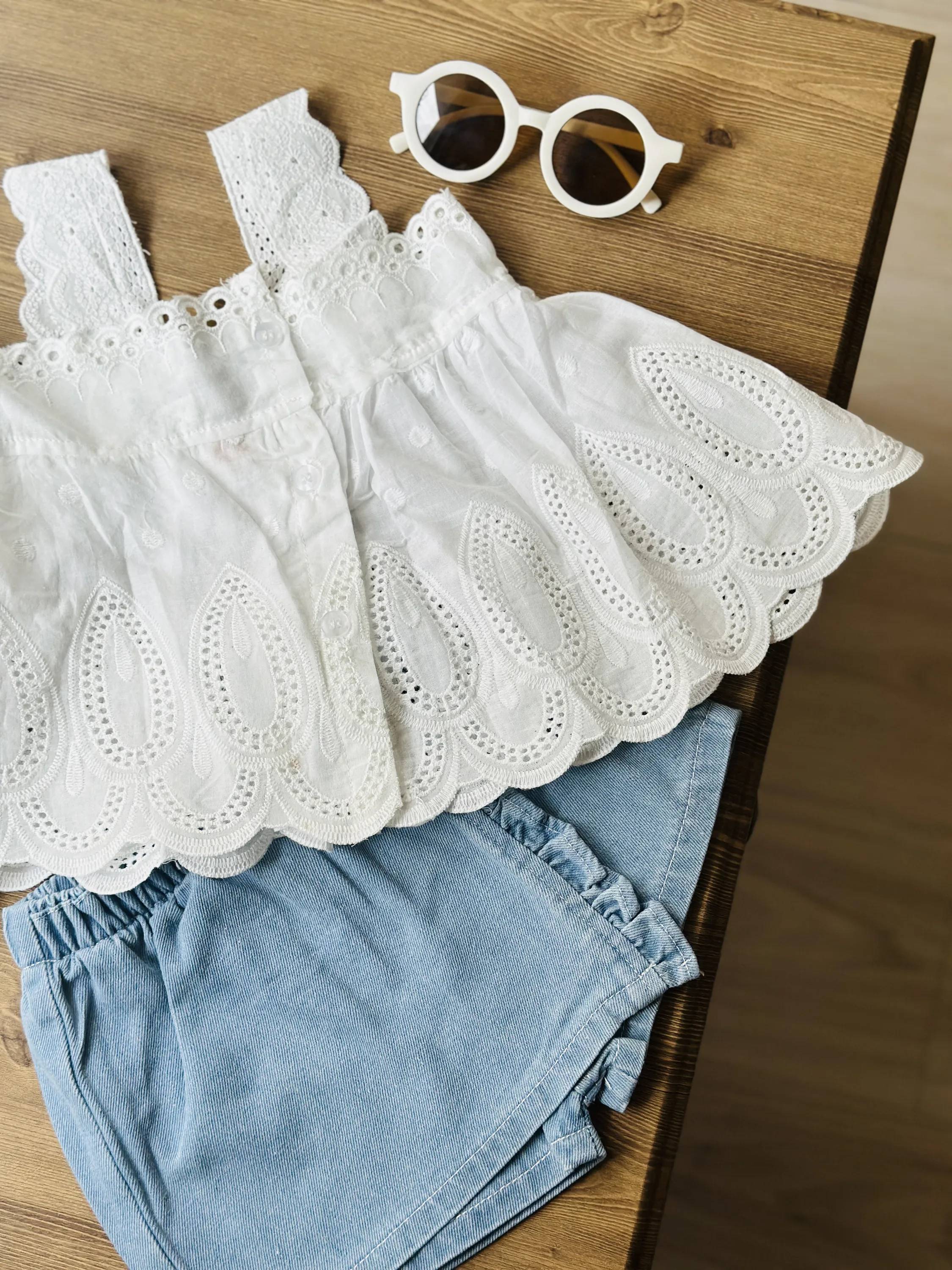 دو تیکه تاپ خامه دوزی با شلوارک جین
